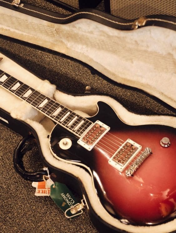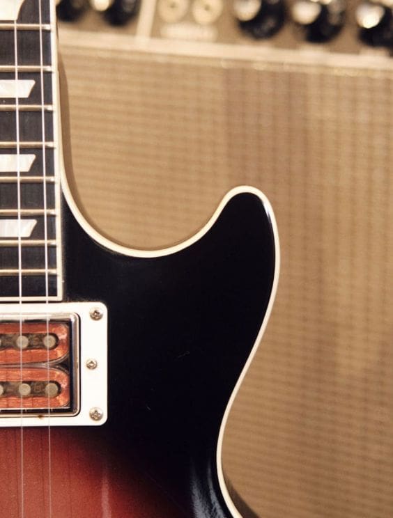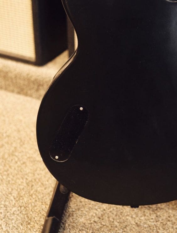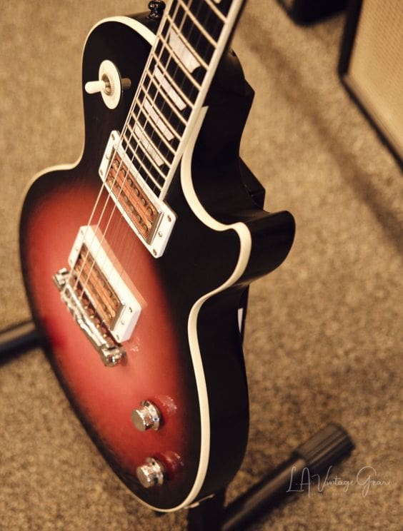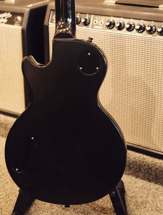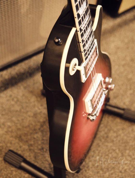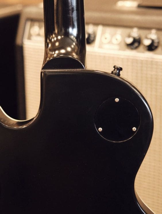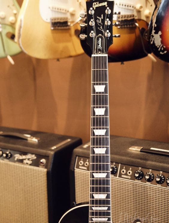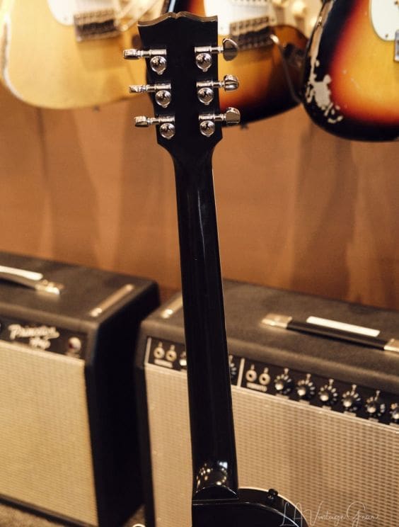 Neck Details: One-piece mahogany set neck with a bound ebony board, trapezoid pearloid inlays, truss adjustment at the headstock
