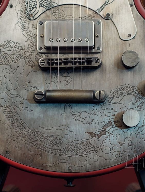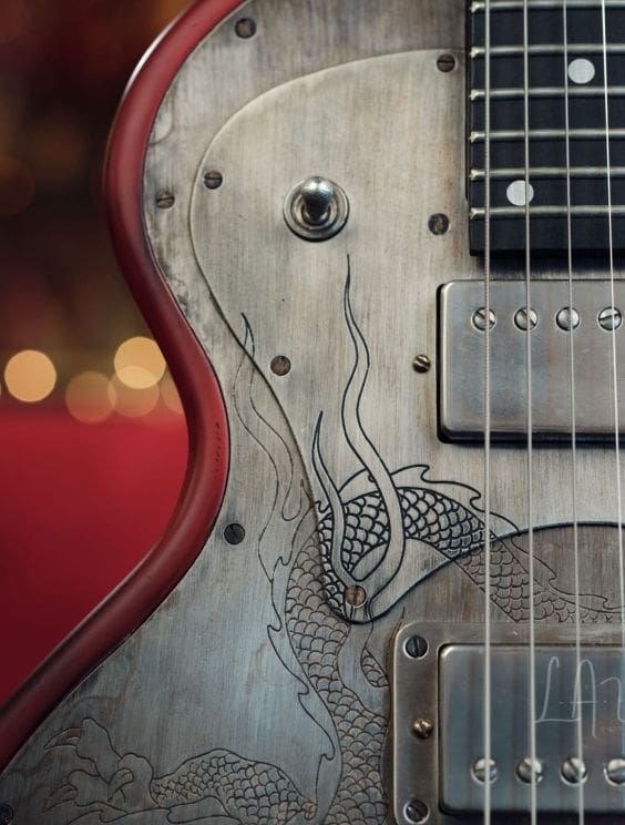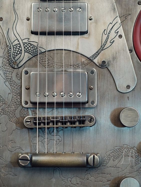 The SteelTop has the look and feel of a vintage instrument while also featuring another James Trussart original invention: the recessed steel top plate. The metal plate sits in a recessed area on the face of the instrument, which keeps the edge of the metal plate covered, adding comfort as well as styling. In addition to the recessed steel top plate, our exclusive chambered wood body and custom metal appointments are beautiful to look at as well as being functional. For instance, the recessed steel head cap adds mass to the headstock and increases sustain. The steel, while also being the perfect medium to display the beautiful Trussart custom finishes and engraving, also has tonal advantages. The SteelTop tone is a uniquely classic sound that, combined with the resonant qualities of the chambered body and steel top, can range from sweet thick classic tones to the heaviest lead tones.