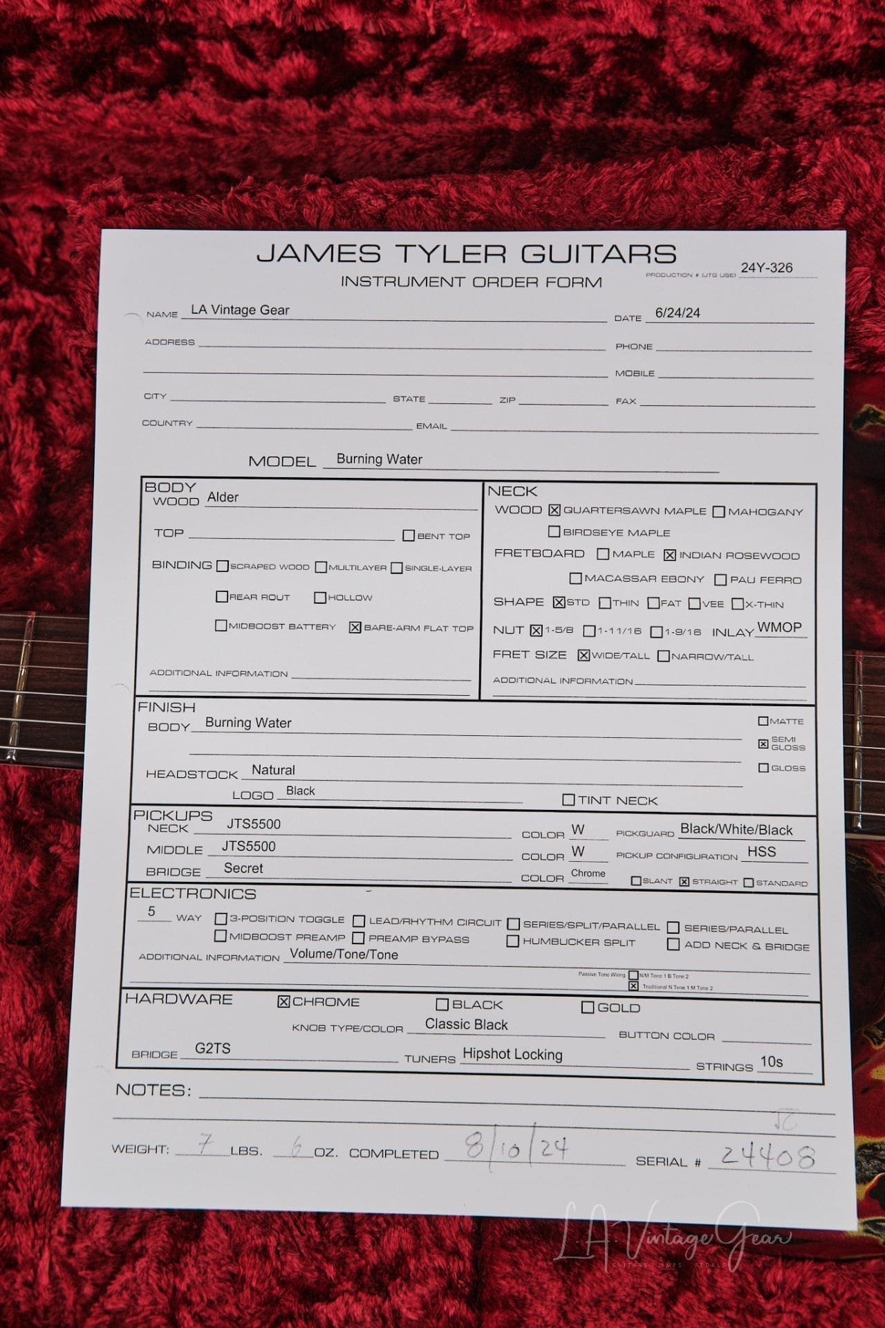 James Tyler ‘Burning Water’ Finish Electric Guitar – with Bare Wood Arm Contour – Brand New In Stock!