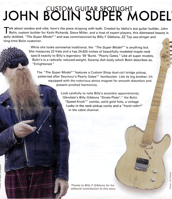 One of Bolin’s big breaks came in 1985, when John acted on a friend’s suggestion to build a guitar for Billy F. Gibbons of ZZ Top, who were playing in Boise. After intense homework and hours in the shop, John managed to build a not only a guitar, but also a matching bass. In two weeks, the shop turned out a hot-rod influenced design covered in a metal-flake candy apple red paint job.