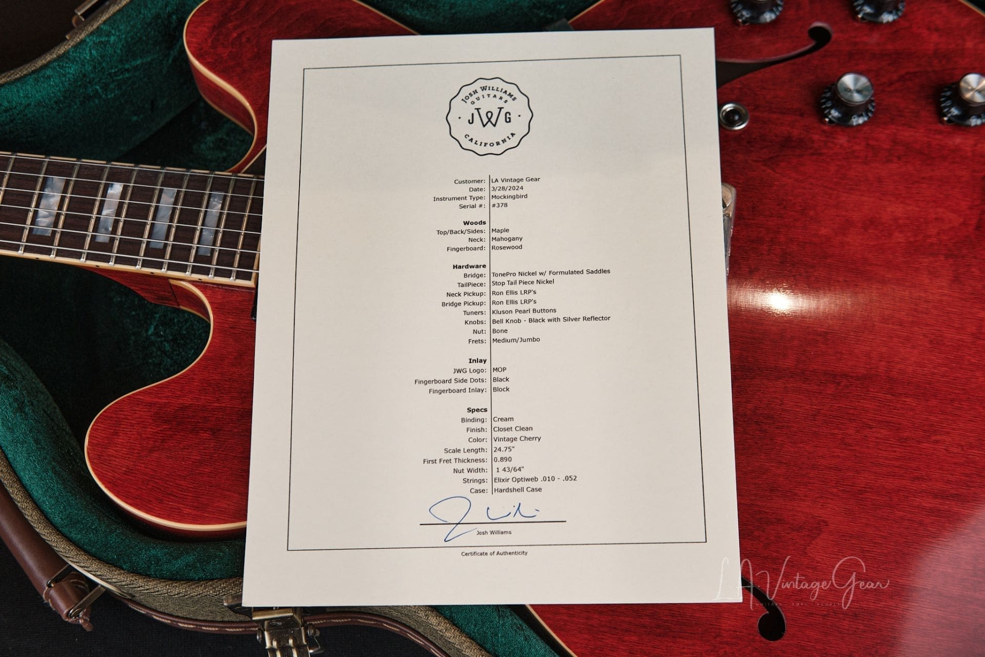 Josh Williams ‘Mockingbird’ JWG378 Semi-Hollowbody Electric Guitar- Vintage Cherry Finish & Ron Ellis Pickups!