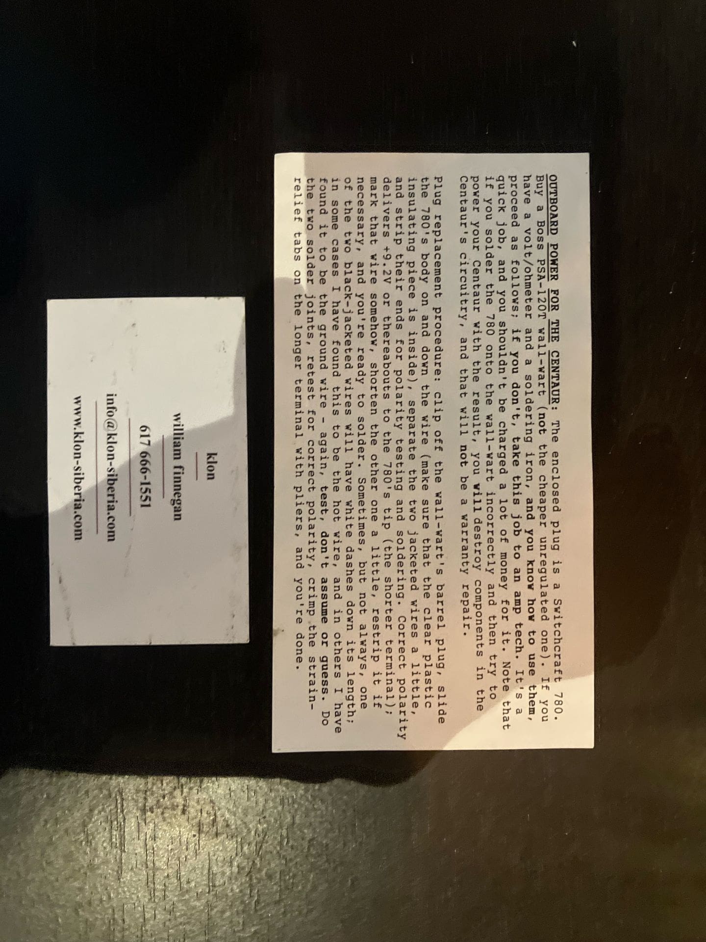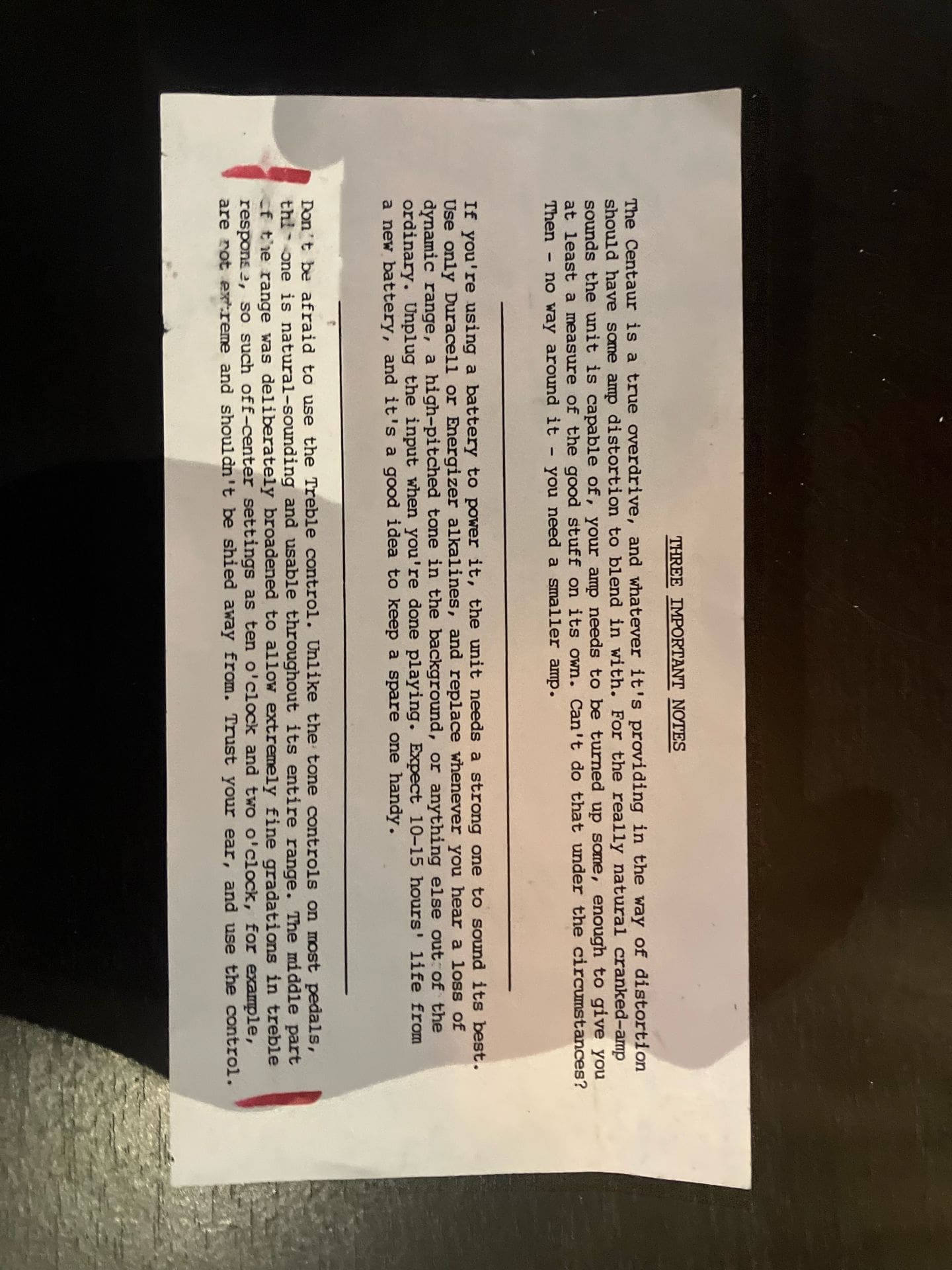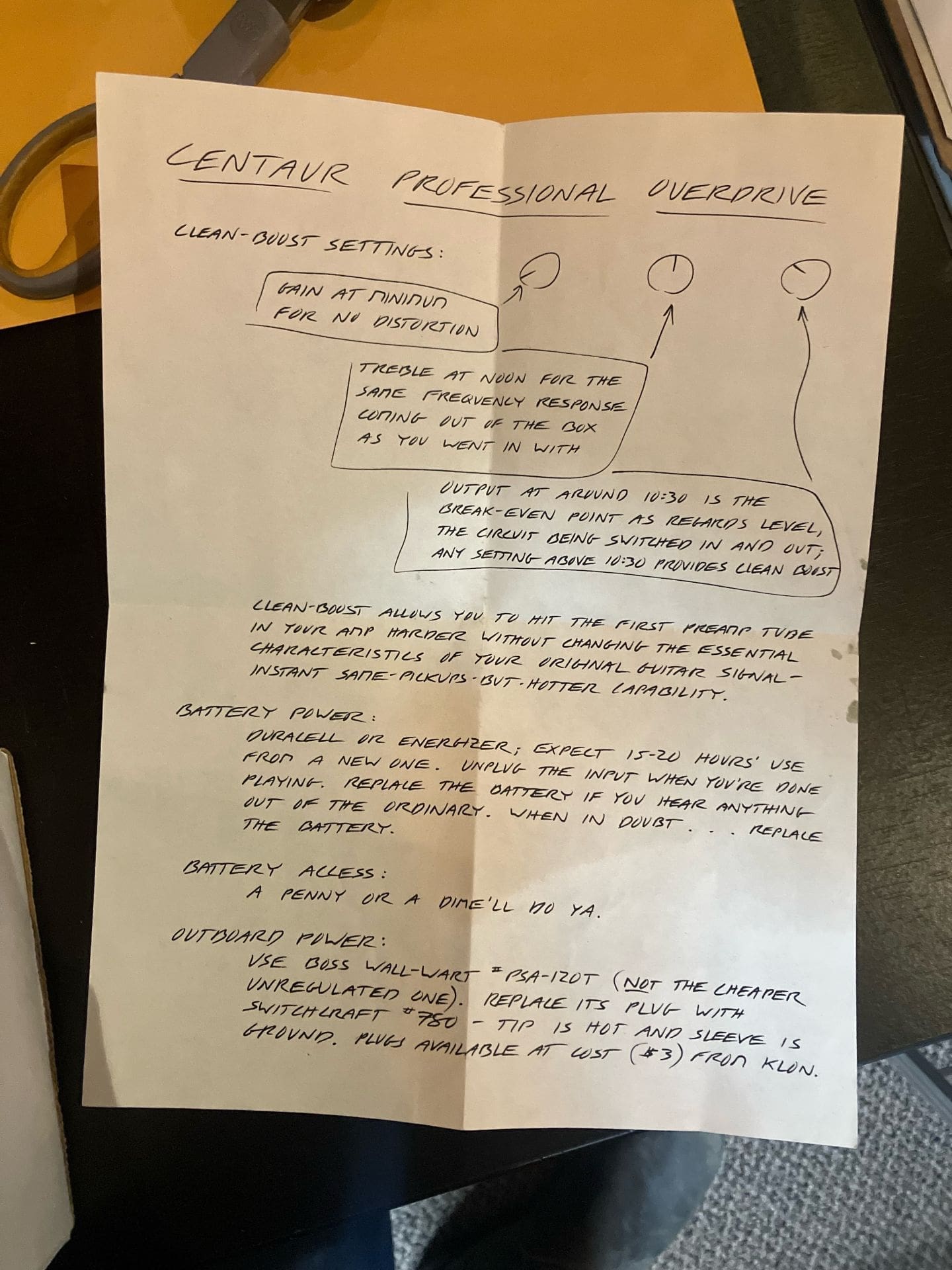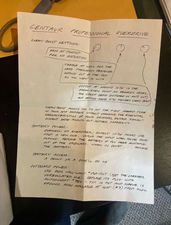 "The Klon Centaur is a guitar overdrive pedal developed by Bill Finnegan between 1990 and 1994. The pedals were made manually by Finnegan. The Centaur is characterized as a "transparent" overdrive, meaning it adds gain to the signal without significantly altering the tone of the guitar. About 8,000 units were built between 1994 and 2009. Guitarists praised the clear, uncolored tone of the boosted signal. The circuit had unique characteristics, most noticeably the use of an IC MAX1044 voltage converter. The voltage converter drives 18 volts to the operational amplifier which is the core of the circuit; at this voltage the response of the amplifier is different from at 9 volt, since its slew rate depends on the voltage supply. The higher the voltage supply, the higher the order of harmonics the operational amplifier will generate, and the more "metallic" the sound. Among the guitarists who use the Klon Centaur are: Mark Tremonti, Jeff Beck, Warren Haynes, Britt Daniel (Spoon), Nick Valensi (The Strokes; CRX) John Mayer, David Grissom, and Adam Hann (The 1975). Nels Cline of Wilco once said, describing his Klon "...It's an amp in a box. No more worries in the world of 'amp du jour' about overdrive tone. It will be OK. The Centaur will take care of it..." Thaddeus Hogarth, a guitar professor at Berklee College of Music, describes the tone of the Klon as "dynamic...it works in combination with your guitar sound..."