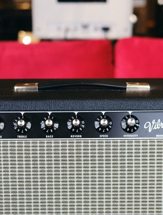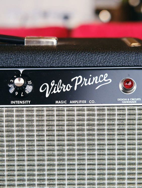 The Vibro Prince is a near perfect replica of a 1967 Princeton Reverb modeled after a killer original ’67 Princeton Reverb. The late Blackface and very early drip edge Silverface Princeton Reverbs were some of my favorite Princeton models. They seem to have a ballsier sound than the earlier versions. The speaker choices were also better including my favorite; the Jensen C10NS. The Vibro Prince is equipped with: voltage correct Mercury Magnetics transformers, proprietary Weber/Magic MGK-C10N and MGK-C12N speakers, Sozo Blue Molded capacitors, Sprague Atom and F&T electrolytic capacitors, correct color-coded cloth covered wire, proprietary replica chassis, period correct reverb cables that look and sound exactly like the originals, full sized reverb pan.
