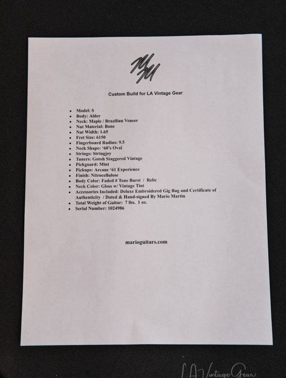 Here's another Custom Build for L.A. Vintage gear... A Mario Martin "Model S" Electric Guitar - Relic'd Faded 3 Tone Burst Finish & Arcane Pickups! Comes with a hand embroidered MM Gig Bag & Signed COA.