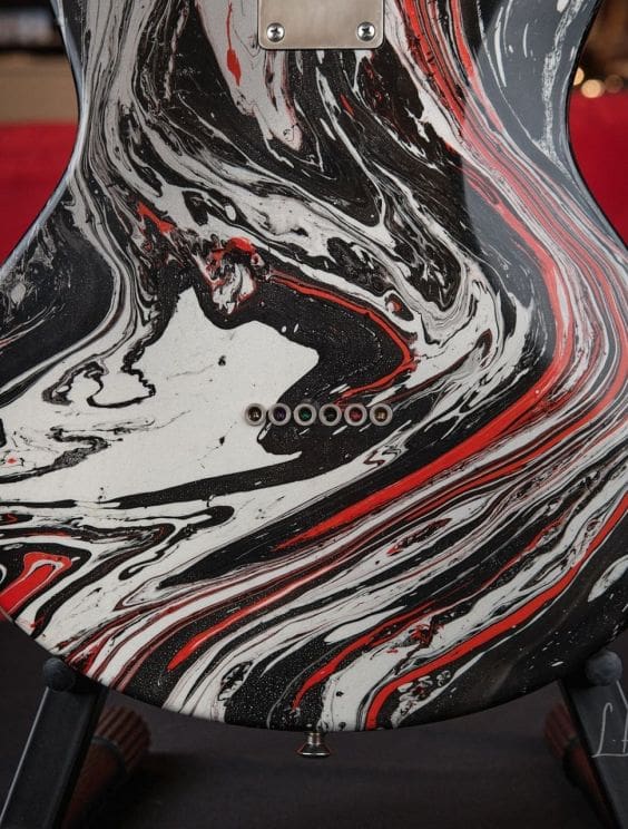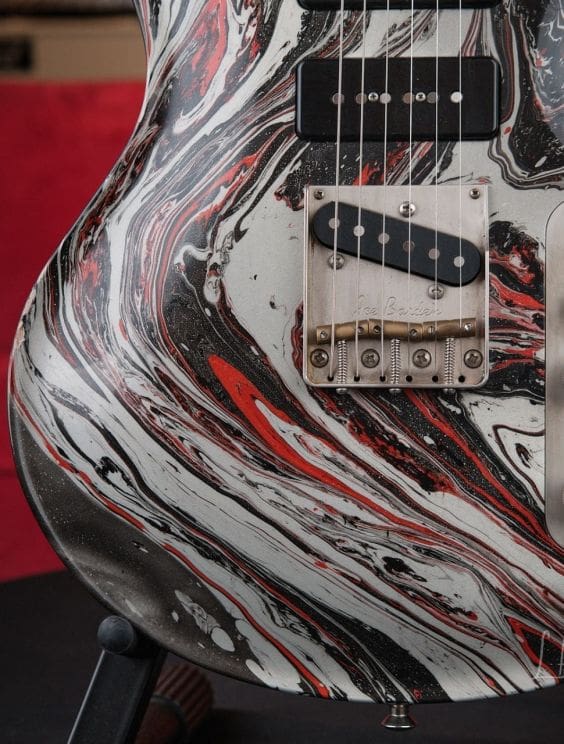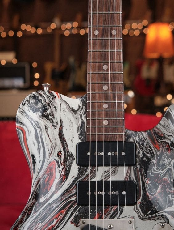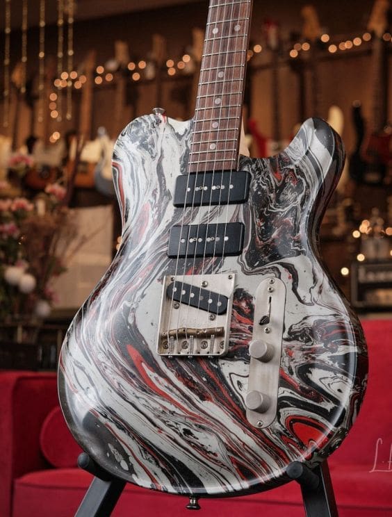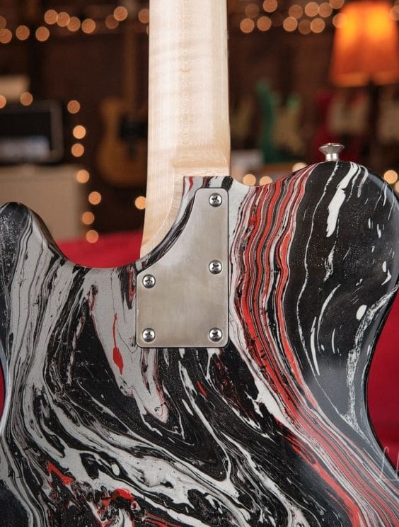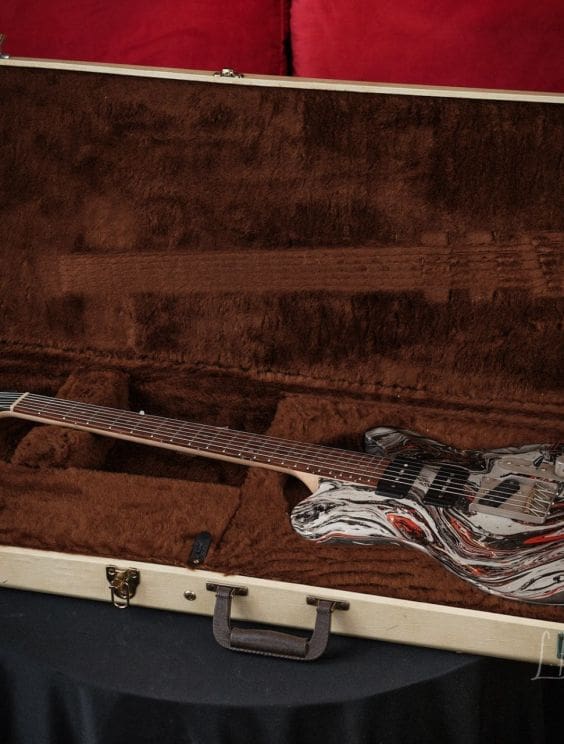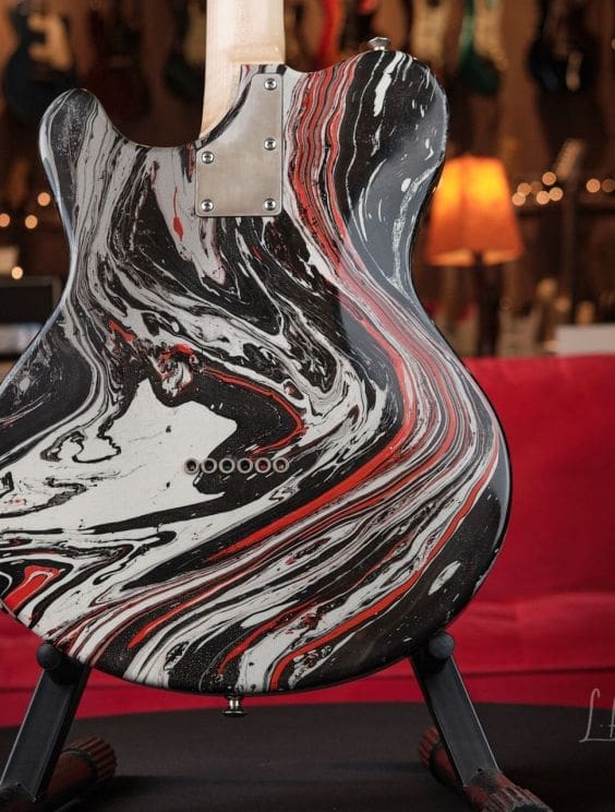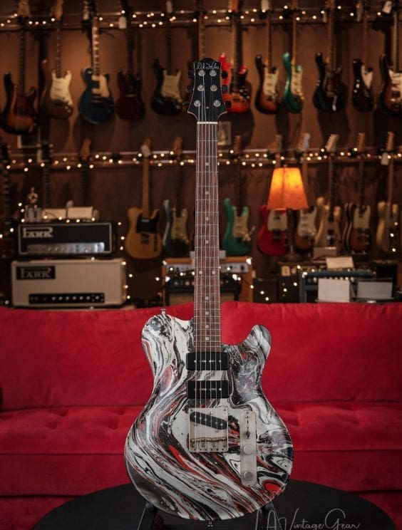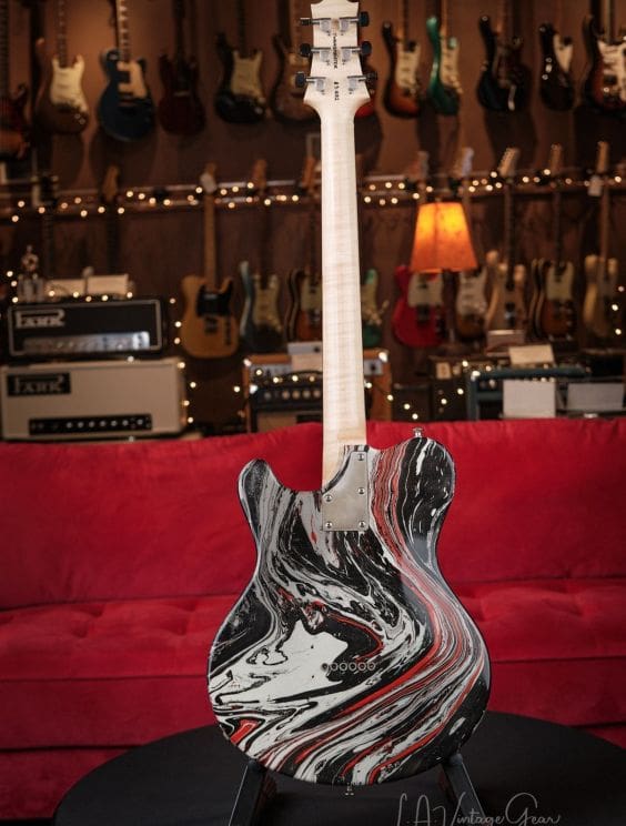 Here we have a Nik Huber Twangmeister in a silver, black, and red bowling ball swirl. This guitar is in excellent shape and plays and sounds amazing. This guitar features tons of amazing premium options and is a truly unique piece!