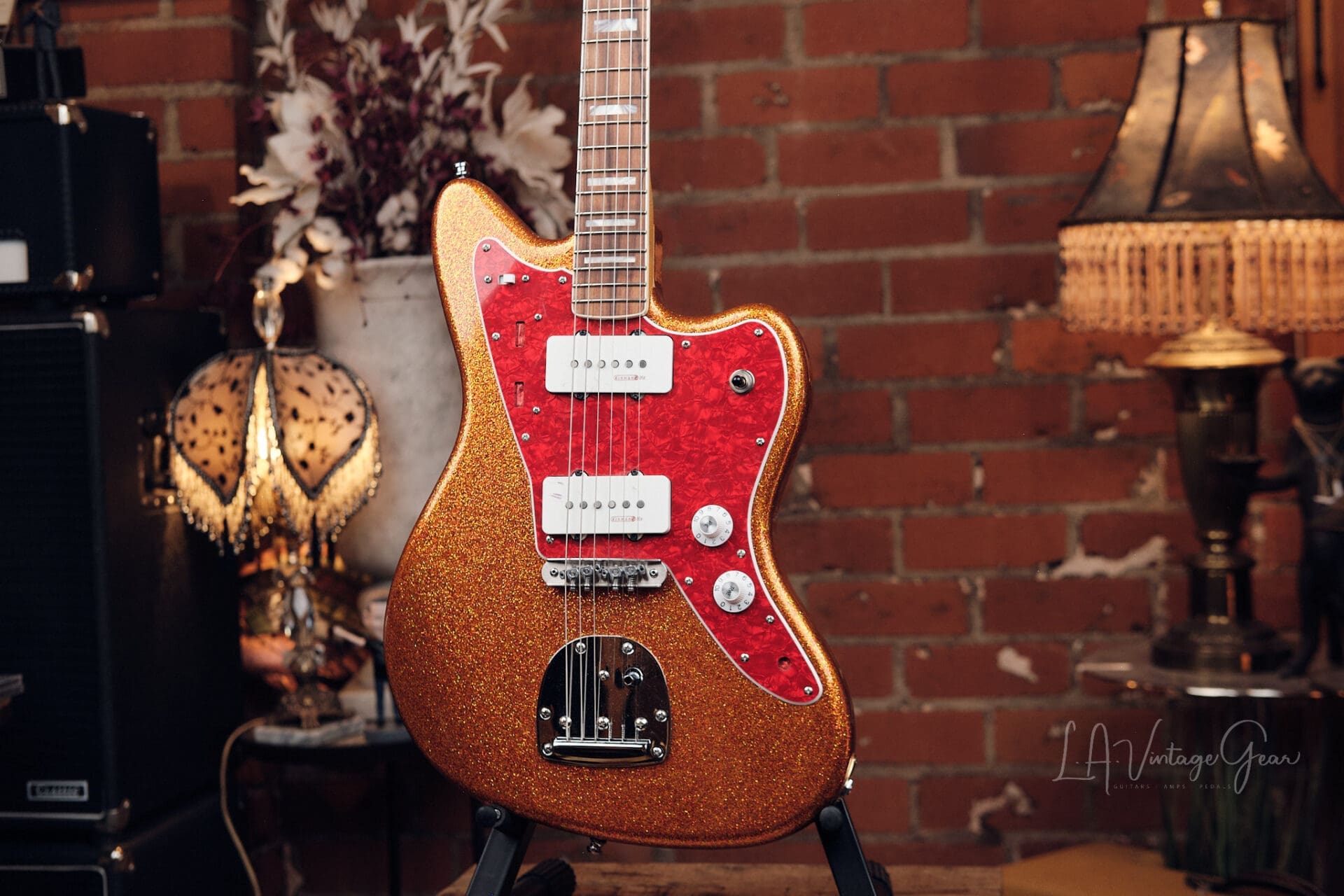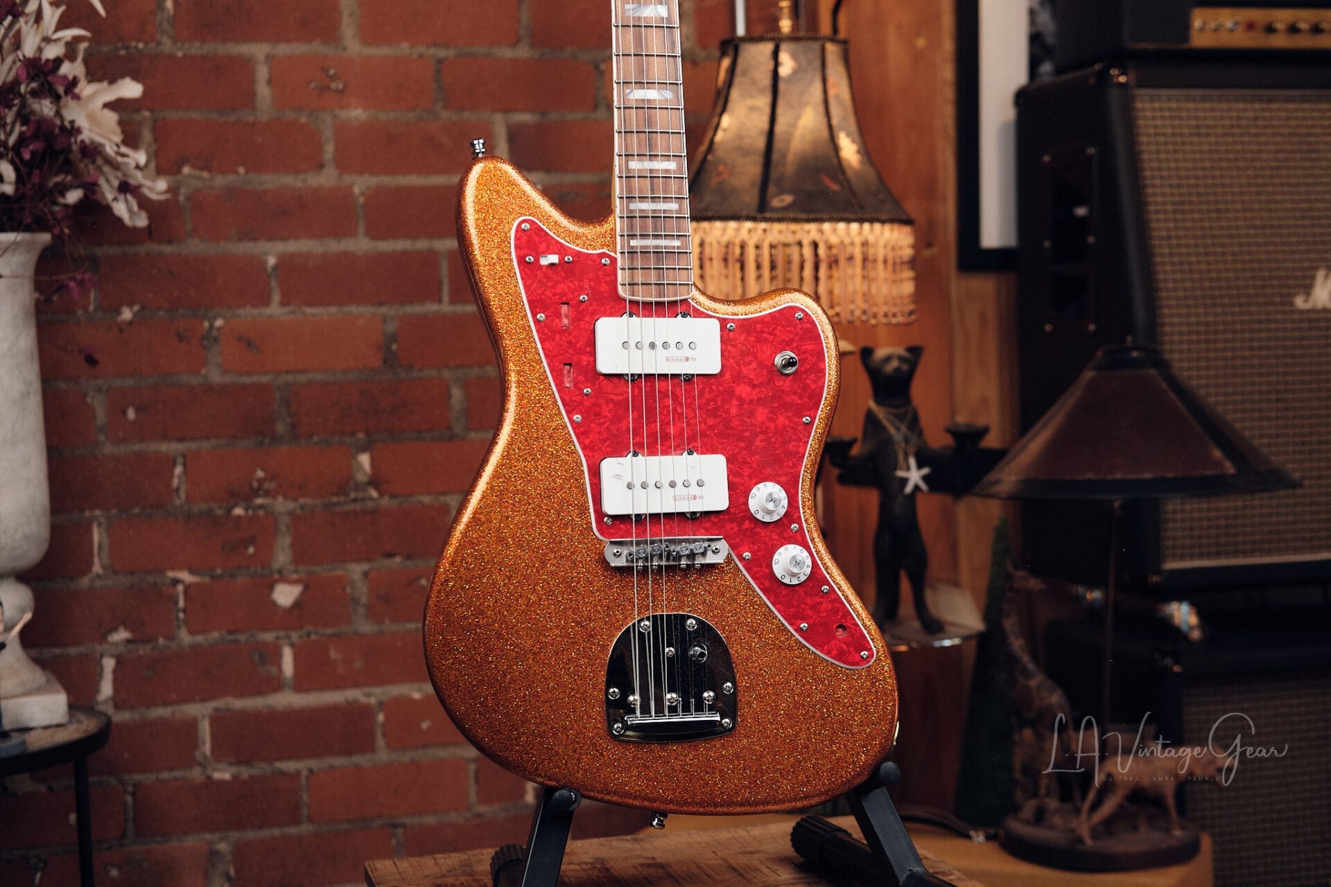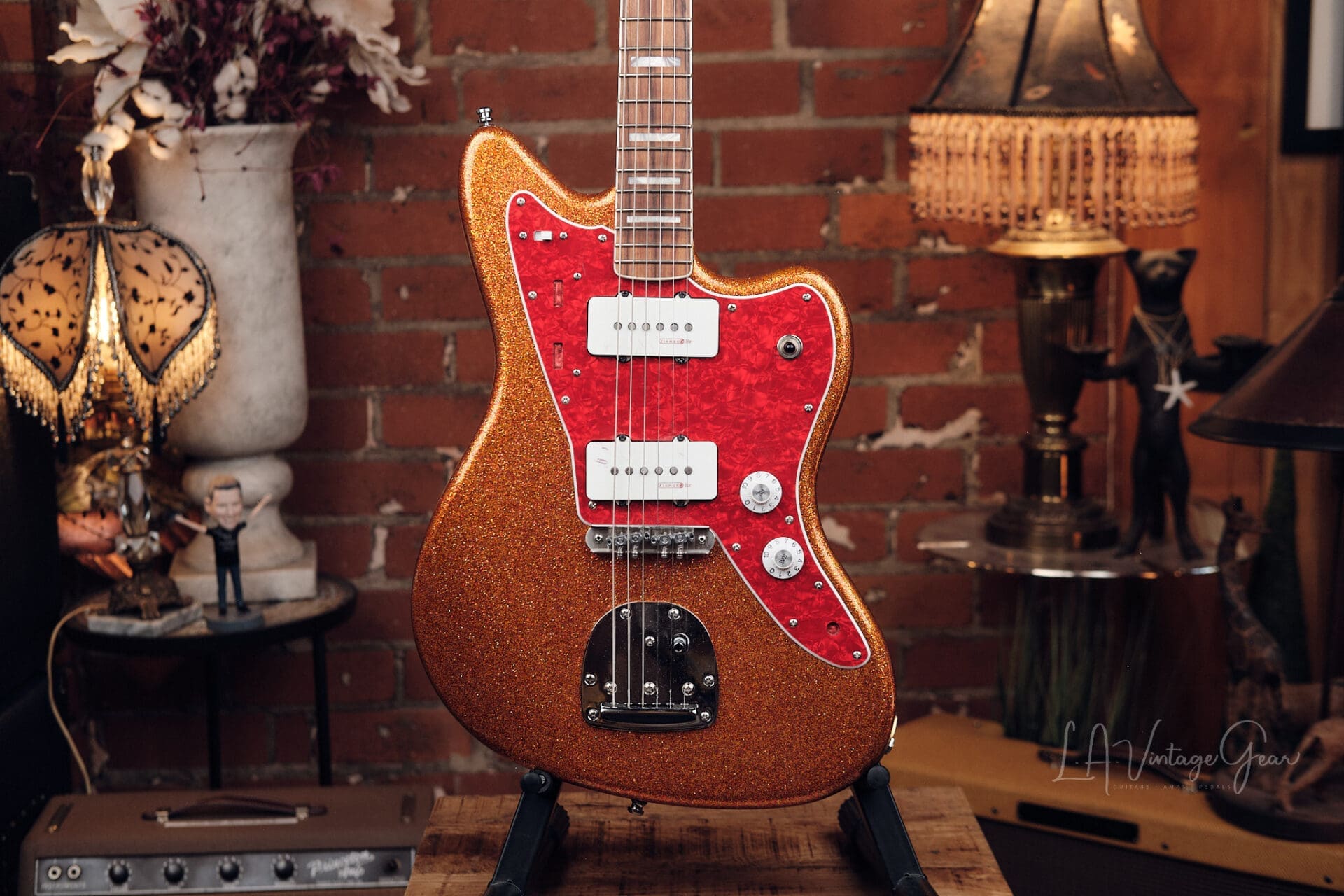 LA Vintage Gear is proud to present this custom-built Jazzmaster-style “partscaster” from the personal collection of Rick Springfield. Finished in a striking orange sparkle, this is a stage-ready, artist-owned instrument with pro-level upgrades throughout. Includes a signed Certificate of Authenticity confirming Rick’s ownership.