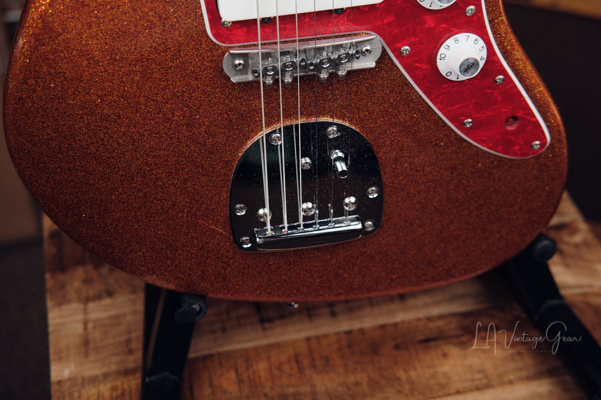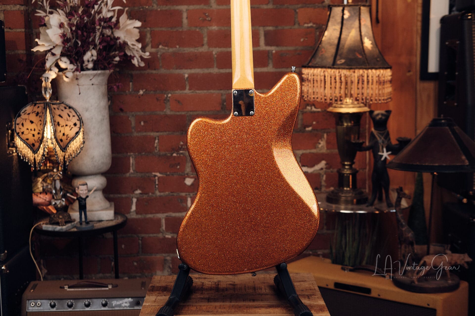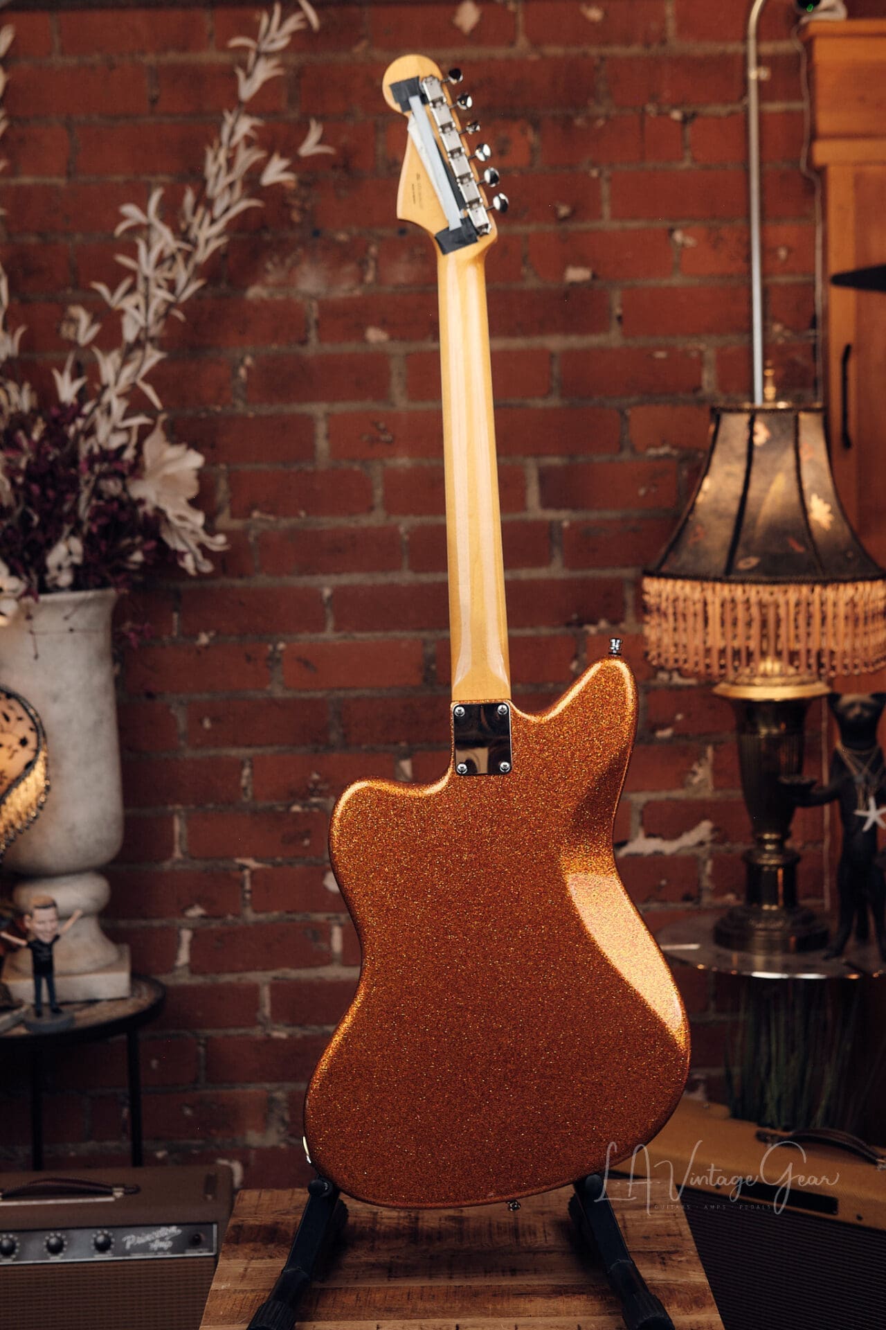 LA Vintage Gear is proud to present this custom-built Jazzmaster-style “partscaster” from the personal collection of Rick Springfield. Finished in a striking orange sparkle, this is a stage-ready, artist-owned instrument with pro-level upgrades throughout. Includes a signed Certificate of Authenticity confirming Rick’s ownership.