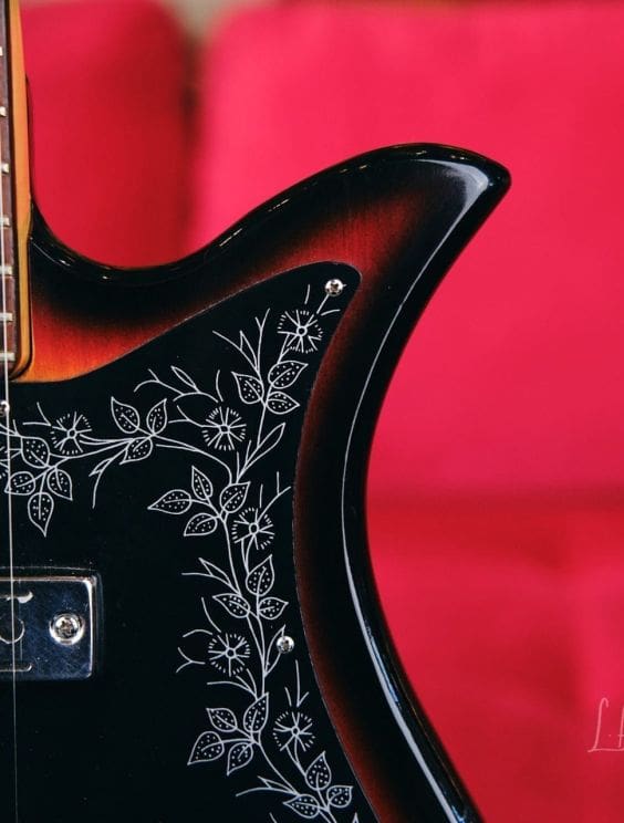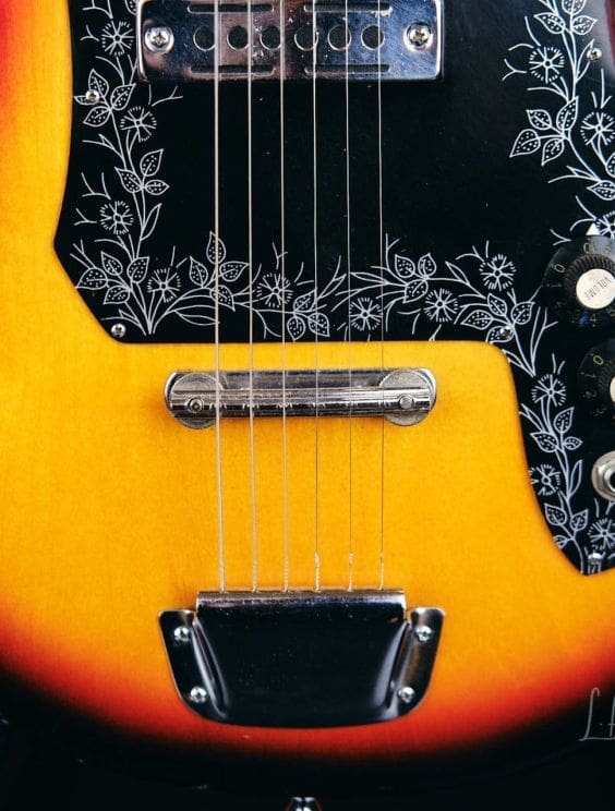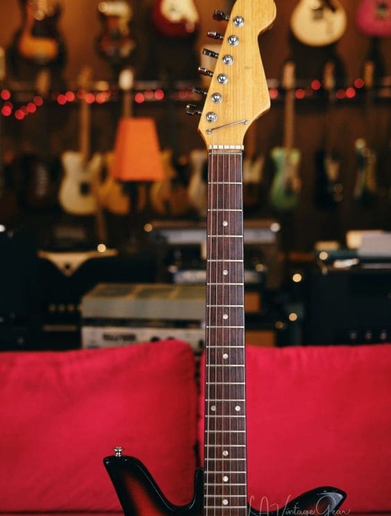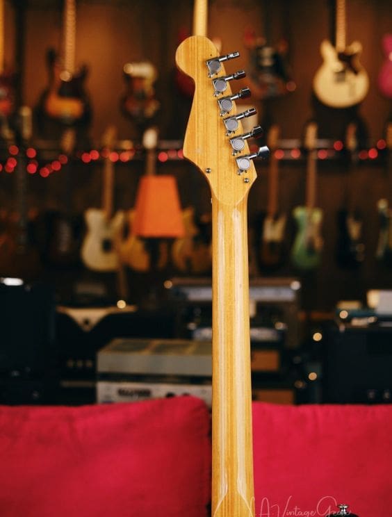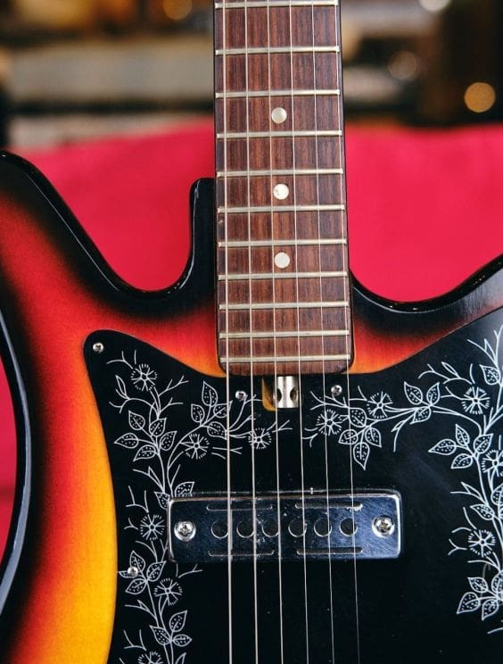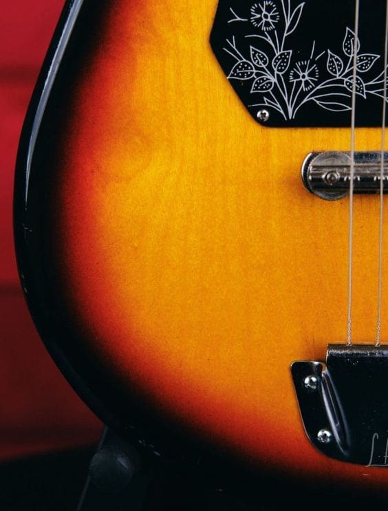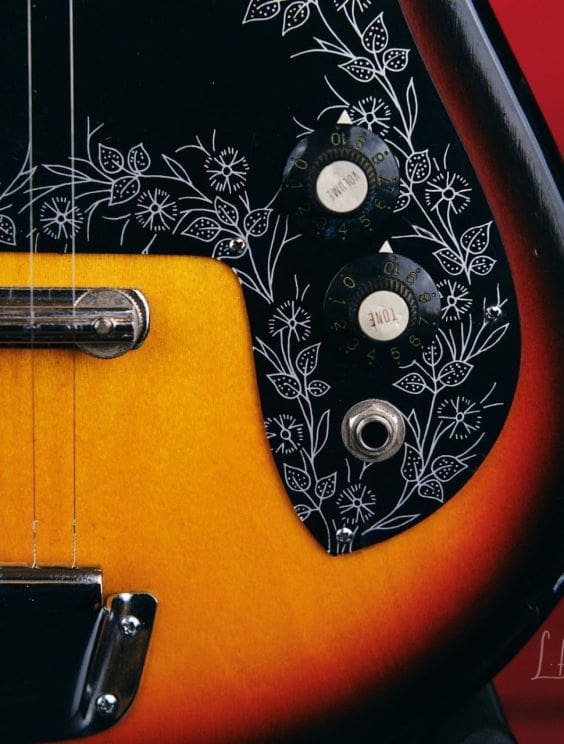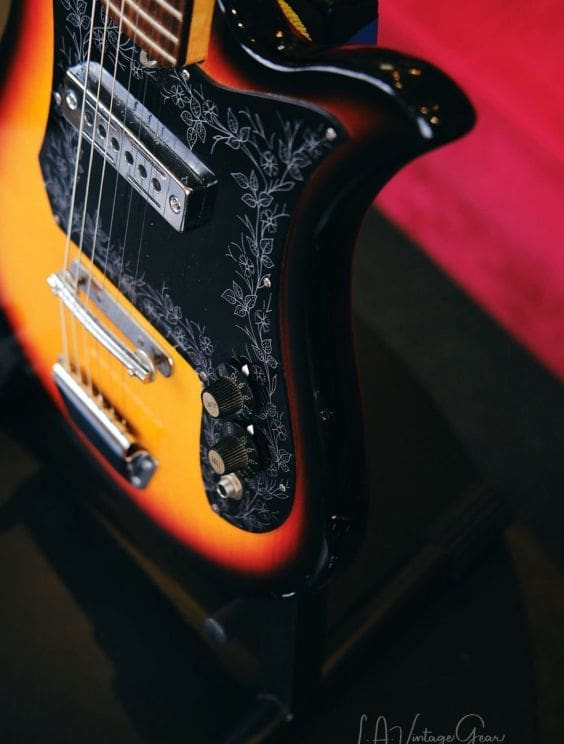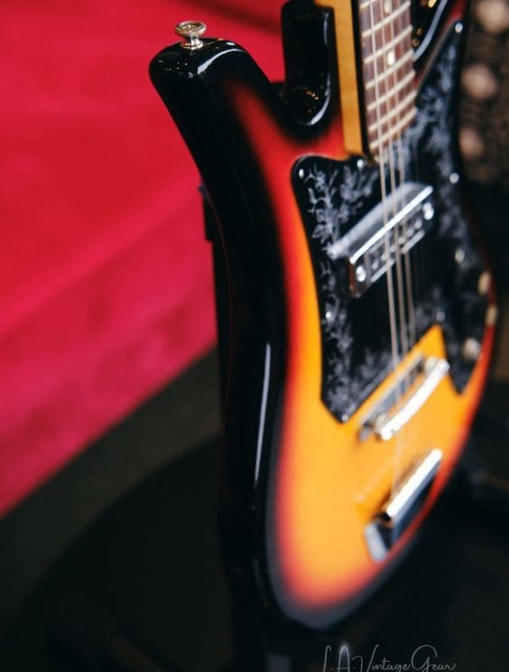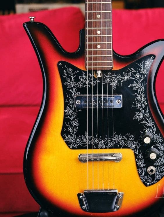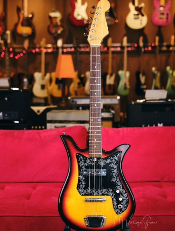 Vintage Teisco Tulip guitar made in Japan in the 1960s. Everything works great! Shows some wear as you would expect for a vintage instrument. The tuners were replaced, but the guitar appears to retain its originality otherwise.